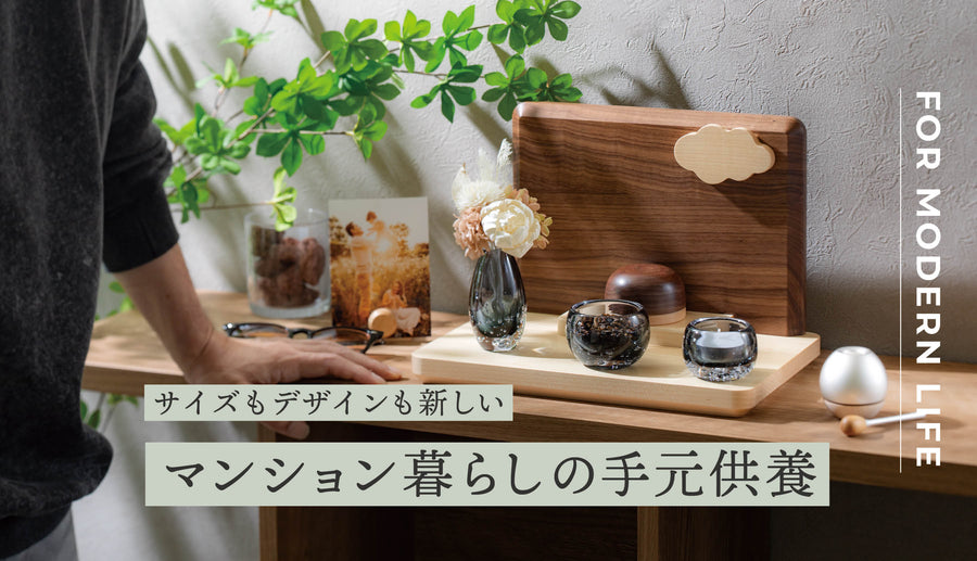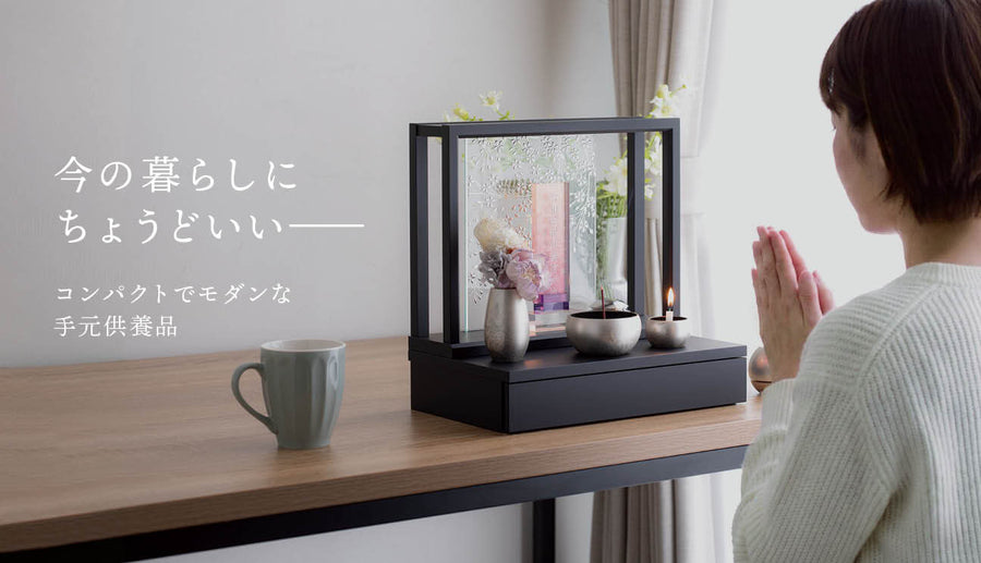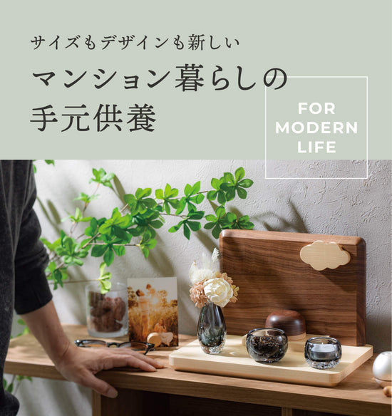 日本製の安心感をお届けウォールナットのスタイリングセット こちらのセットに含まれている全てのアイテムは、すべて日本製です。日本の熟練職人が一つ一つ丁寧に仕上げた逸品を厳選して組み合わせました。長くご愛用いただけるよう、安心してお使いいただける日本製品をお届けいたします。品質と信頼の日本製で、心を込めてお届けするこのセットをぜひご堪能ください。 こちらのセットは、ウォールナットをベースにし、グレーのシックなガラス仏具を組み合わせた洗練されたデザインです。落ち着いた輝きが印象的で、モダンなテイストを加えたスタイリッシュなセットとなっています。ミニ骨壷もウォールナットで統一されており、全体として高級感があります。また、ステージに付属するマグネットの空型を組み合わせることで、優しい印象に早変わりします。どのようなお部屋にも自然に馴染むよう、細部まで配慮されたコーディネートが施されています。 それでは、それぞれの商品をご紹介しましょう。 ステージ:ルオントシリーズ 空 ウォールナット ベースとなるステージの背面には、インテリアで人気のウォールナット無垢材を使用しています。この素材は高級感を漂わせ、お部屋に温かみをもたらします。一方、土台には美しい白肌のメープル材を採用しており、その組み合わせは非常に魅力的です。ウォールナットとメープルという2種類の木材を巧みに組み合わせることで、さまざまなお部屋や家具に調和し、自由なコーディネートが可能になります。 セットは単品で購入するより、お求めやすくなっております。 三具足:a-wa グレー 三具足は、a-wa グレーの高級感溢れるガラスで仕上げられており、その洗練された印象が特長です。グレーのガラスが醸し出す落ち着いた色合いと輝きが、品のある高級感を演出し、どのようなお部屋にもエレガントな雰囲気をもたらします。洗練されたデザインが、空間に一層の格調を加え、落ち着きと美しさを引き立てます。 ミニ骨壷:ルオントシリーズ ふくら ウォールナット ミニ骨壷には、上部に可愛らしいくぼみが施されたルオントシリーズ「ふくら」を採用し、その優しい形状が特徴です。このミニ骨壷はウォールナットで仕上げられており、全体に統一感をもたらしています。ウォールナットの深みのある色合いと温かみが、洗練された印象を与え、どこに置いても自然に溶け込む美しいデザインです。全体として調和が取れた、心温まるセットとなっています。 りん:チェリンウッド シルバー りんは、チェリンウッドのシルバーです。シルバーの洗練された光沢が、シンプルでありながらもモダンな美しさを演出し、どのようなお部屋にもエレガントに調和します。下部のウッドの質感とシルバーの輝きが、空間に洗練された雰囲気を加えます。 お花:あわいろフラワー ホワイト お花には、あわいろフラワーのホワイトを使用しています。スタイリッシュなデザインの中に、花の持つ癒しの力がしっかりと息づいています。オフホワイトベースの花の組み合わせは、主張しすぎることなく、優しくお部屋を包み込みます。その繊細な色合いと品のあるデザインが、落ち着きと温もりをもたらし、心地よい空間を演出します。 ステージは、A4ノートとほぼ同じサイズで設計されているため、置く場所を選ぶことなく便利にご使用いただけます。そのコンパクトなサイズ感が、どんなスペースにも自然に馴染み、設置場所を選ばずにお使いいただけるのが特長です。デザインに無駄がなく、どこに置いても調和するため、様々なお部屋や環境でご活用いただけます。写真はグレー色。 ステージの印象を簡単に変えられる丸型と雲型のマグネットが付属しており、その使い方次第でデザインに変化を持たせることができます。使わないマグネットは、横に置いて写真立てとして活用できるなど、多機能で実用的です。このような細やかな工夫が施された日本製の逸品は、機能性と美しさを両立させ、どんな場面でもその真価を発揮します。 4ノートとほぼ同じサイズで設計されているため、置く場所を選ぶことなく便利にご使用いただけます。 ステージと同シリーズのお位牌もございます。(別売) すべてのアイテムが日本製で統一されたこだわりのセットです。品質の高さと細部への配慮が感じられる逸品です。どれも熟練の職人による丁寧な仕上げが施されており、安心して長くご愛用いただけるセットとなっています。 ステージ部分の紹介動画です。※動画内の仏具等の組み合わせは、セットの付属品と異なる部分がございます。 サイズガイド サイズ(mm) H220×W300×D210mm カラー展開 ダークブラウン セット内容 ・ステージ:ルオントシリーズ 空 ウォールナット・ミニ骨壷:ルオントシリーズ ふくら ウォールナット・三具足:a-wa グレー・りん:チェリンウッド シルバー・お花:あわいろフラワー ホワイト ※サイズは目安です。手作りのため、サイズや形状等に個体差
