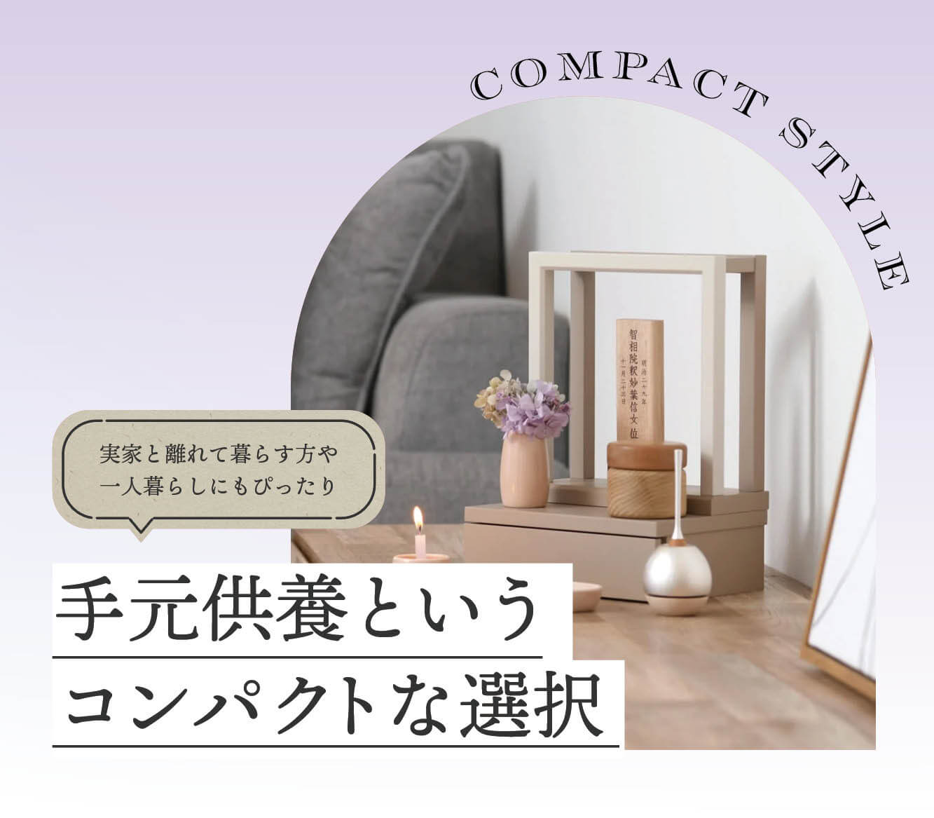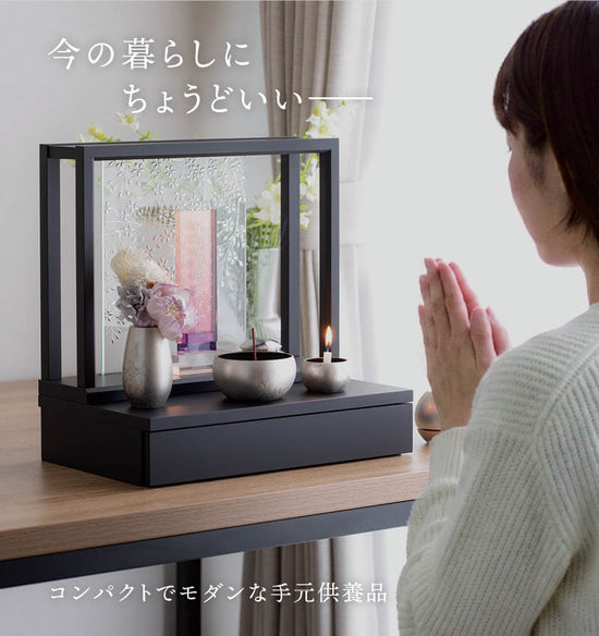 インテリアに馴染むカラーリング明るい光が差し込むおしゃれなミニ仏壇 ミニ仏壇HIKARIは、明るく開放的でインテリアに馴染むおしゃれなお仏壇です。 両脇から自然光を取り入れる設計で、心地よい雰囲気を醸し出します。伝統的な仏壇の厳かさと、手元供養のオープンな開放感を兼ね備えたデザインです。色はモダンで優しいセサミグレーとミルクティベージュの2色展開。おしゃれなミニ仏壇として現代的な室内に馴染みます。 また、本体フレームの下には使い勝手のいい引き出しをセット。故人様の大切な思い出の品や、普段使いのお線香、お数珠などを保管できます。 優しい色合いのミルクティーベージュ シックで上品なセサミグレー 自然光を取り入れられる設計です 上下分けて置く場所を変えることも出来ます コンパクトなA4サイズのミニ仏壇です 引き出し外寸:H66×W200×D150mm引き出し内寸:H40×W155×D110mm 持ち運びも楽々です A4サイズぐらいの大きさです ベッドサイドも祈りの空間に。 ベージュのミニ仏壇に、光の当たり方で表情が変わるピンクのクリスタル仏具をコーディネート。合わせる仏具によって、やさしくかわいらしい雰囲気にもなります。 富士山の美しい麓に広がる静岡県は、家具産地として名高い地域です。HIKARIは、そんな静岡の木工職人たちによって手がけられました。 日本製の安心をお届けします。品質の高さと細部への配慮が感じられる逸品です。熟練の職人による丁寧な仕上げが施されており、安心して長くご愛用いただける商品となっています。 サイズガイド サイズ(mm) H280×W200×D150mm 重量(kg) 1.3kg 生産地 静岡県 材質 MDF カラー展開 セサミグレー・ミルクティベージュ セット内容 本体フレーム・引出し ※サイズは目安です。手作りのため、サイズや形状等に個体差がありますので、あらかじめご了承ください。 動画を再生するには、videoタグをサポートしたブラウザが必要です。