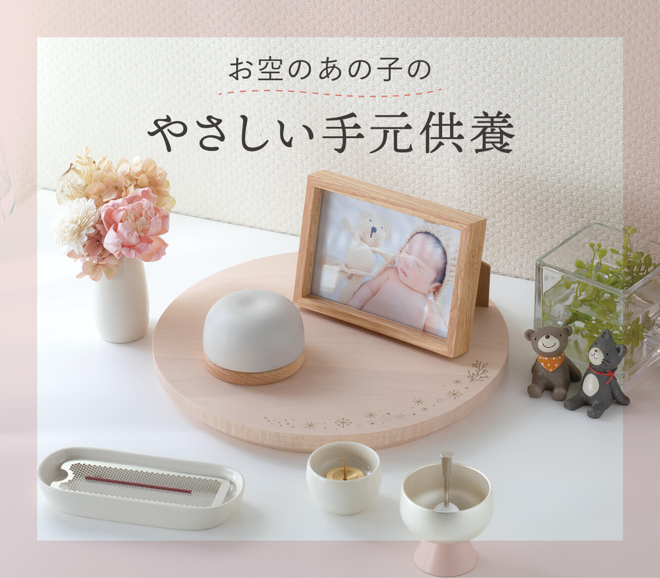 ミモザをベースとした、柔らかく愛らしいセットをお求めやすい価格にまとめました。 北欧風のインテリアにぴったりなナチュラルなセットをご用意しました。メープル材のステージ「ルオントシリーズ ミモザ」は、北欧家具にも使われる美しい白肌が特徴で、その柔らかな色合いは見ている人を、優しい雰囲気に包み込みます。また、ニュアンスカラーが魅力の有田焼のお道具「soil」と組み合わせることで、温かな雰囲気が広がります。soilの香炉は寝かせるタイプの香皿なので、お線香が倒れる心配がありません。さらに、ステージと同シリーズの丸みのあるミニ骨壺「ふくら」を中心に、心地良さと安らぎを感じる空間を演出します。お求めやすい価格ながらも、弔いに必要なお道具は含まれています。 セットは単品で購入するより、お求めやすくなっております。 ステージは、ルオントシリーズ ミモザのピンク シンプルなステージながらも無垢の厚みが贅沢な印象です。薄いピンク色に木目が透けて見えます。薄く均一な塗装も職人の技が光ります。ミモザ柄のスクリーン印刷は上品な金色で仕上げております。 三具足は、有田焼のsoilのホワイト 優しい色合いが全体に馴染みます。寝かせるタイプの線香皿は、火を気にせず安心してお使いいただける人気にカタチです。 ミニ骨壷は、同シリーズのルオントシリーズ ふくらのグレー 優しいデザインながらも存在感があります。上部のくぼみが可愛く、撫でていると不思議と落ち着くと言う方続出。人気のデザインを組み合わせました。 りんは、りん彩のピンク りん彩も淡い色合いなので、ステージの雰囲気とぴったり合います。可愛いデザインながらも、銅器で有名な高岡製の本格派。美しいりんの音色が心を落ち着かせてくれるでしょう。 お花は、あわいろフラワーのピンク 華やかなピンク色が引き立ちます。長く使えるソラフラワーとプリザーブドフラワーを組み合わせました。 画像はウォールナット 穏やかな雰囲気が、天使ママやパパの心を癒してくれるでしょう。 小さな家族ペットちゃんの供養にもいかがでしょうか。 ルオントシリーズの塗装は、優しいニュアンスカラーに木目が透けるよう、塗装の際には木目を塗り潰してしまわないよう、注意しながら均一に塗装しております。「ふくら」は無垢材のブロックから削り出しているため、木材の繊維方向で木の節や導管が逆目に出てくる部分がございます。ルオントシリーズでは、こちらを「木の個性」とし、天然の印として活かしております。節は少し濃くなっている部分で、逆目は手で触ると少しザラっと感じます。逆目は、大切な方の個性と重ね合わせ、ついつい触りたくなる。そんな生きた風合いを感じていただけます。 人にも個性があるように、木にもそれぞれに個性がございます。木目の表情や個性は唯一無二であり、同じものはございません。品質には一切問題はございませんので、天然木だからこその風合いとしてご理解いただければ幸いです。 富士山の美しい麓に広がる静岡県は、家具産地として名高い地域です。ルオントシリーズは、そんな静岡の木工職人たちによって手がけられました。 三具足のsoilは有田焼 日本製の安心をお届けします。品質の高さと細部への配慮が感じられる逸品です。熟練の職人による丁寧な仕上げが施されており、安心して長くご愛用いただける商品となっています。 「soil」に使用している寝かせる線香皿用の交換網です。繰り返しご使用いただくうちに焦げ目がつき、徐々に劣化してまいります。網は消耗品となりますので、劣化後はお取り替えいただくことをお勧めいたします。交換用の網も下記ページよりご購入いただけます。 「【お道具】soil 寝かせる線香皿用 交換網 SB2」 サイズガイド サイズ(mm) φ250×H20mm カラー展開 ピンク セット内容 ・ステージ:ルオントシリーズ ミモザ ピンク・ミニ骨壷:ルオントシリーズ ふくら グレー・三具足:soil ホワイト・りん:りん彩 ピンク・お花:あわいろフラワー ピンク・フォトフレーム:ウッドフレーム SB10 ※サイズは目安です。手作りのため、サイズや形状等に個体差がありますので、あらかじめご了承ください。 動画を再生するには、videoタグをサポートしたブラウザが必要です。